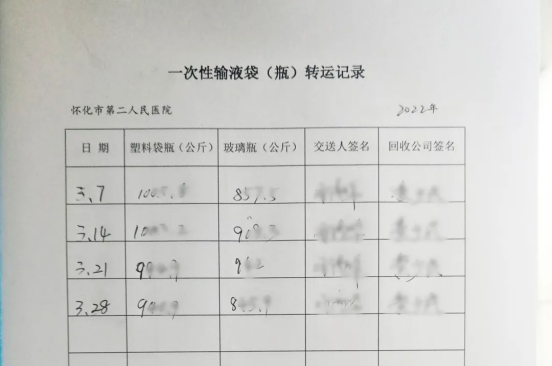 怀化市第二人民医院,2018年以来共回收一次性输液玻璃瓶26.2432万公斤,一次性输液塑料袋17.3120万公斤,每年减少医疗废物处置费约20万元。同时,一次性输液瓶(袋)的回收再利用,还有效防止了可能造成的疾病感染与环境污染,达到了“变废为宝、变害为利”的双赢目标。